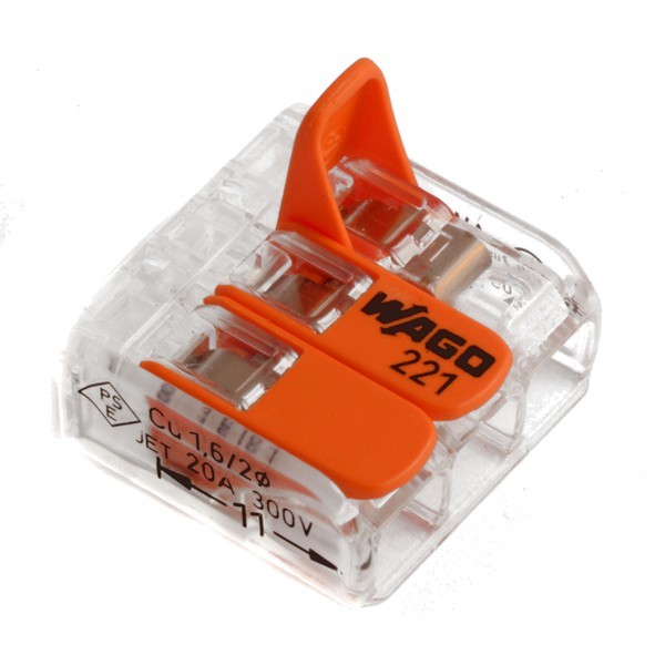 Миниатюрный соединительный клеммник на два провода с нажимными рычагами и прозрачным корпусом. Для подключения тонких проводов от 0,25мм.кв.