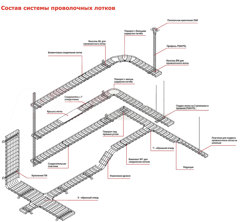 Проволочные лотки ДКС прочны, безопасны и не требуют большого количества аксессуаров, но это не мешает создавать из них сложные конструкции, ведь любые разветвления и повороты можно производить вручную при помощи кусачек и гаечного ключа.