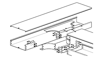 Для монтажа DL-ответвителей применяются соединитель GTO и соединительные накладки CGB. Данные монтажные аксессуары устанавливаются во внутреннюю часть лотка. Для соединения крышек применяются соединительные накладки CGC, которые устанавливаются сверху на крышки. Гайки располагаются с внешней стороны бортов.