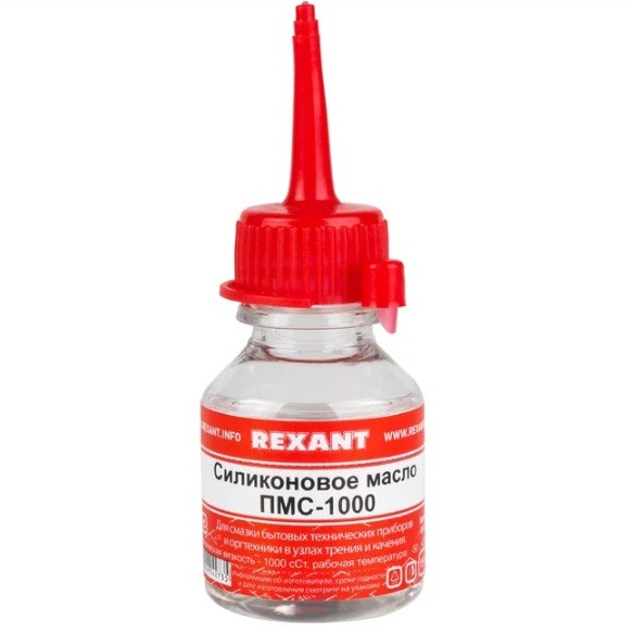Силиконовое масло Rexant ПМС-1000 предназначено для смазывания малонагруженных деталей в механизмах трения и качения в приборах, бытовой и оргтехнике. Масло ПМС (полиметилсилоксаны) - прозрачная, бесцветная, химически инертная и коррозионностойкая жидкость. В отличие от минеральных или синтетических масел, данная жидкость обладает превосходными электроизоляционными, антиадгезионными и пеногасящими свойствами.