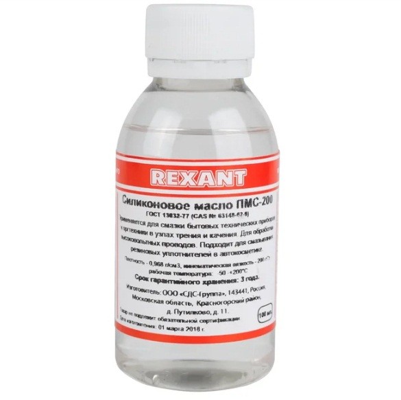 Силиконовое масло Rexant ПМС-200 используется для смазывания резиновых уплотнений, обработки высоковольтных проводов, в производстве для пресс-форм РТИ и пластмасс , в паяльных ваннах для защиты расплавленного припоя от окисления и в других местах, где необходимо создать отличное разделяющее действие, легко образуя пленки на самых разных поверхностях (металл-пластик, пластик-резина и т.п.).