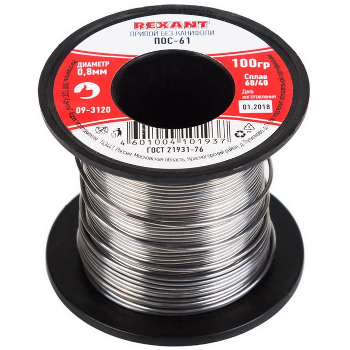 Представляет собой проволоку (диаметром 0,8 мм) из сплава олова (60 %) и свинца (40 %). Как действует припой: нагреваясь до определенной температуры (165...175 °C) он расплавляется, смачивает спаиваемый металл, растекается по нему, заполняя место между соединяемыми деталями.