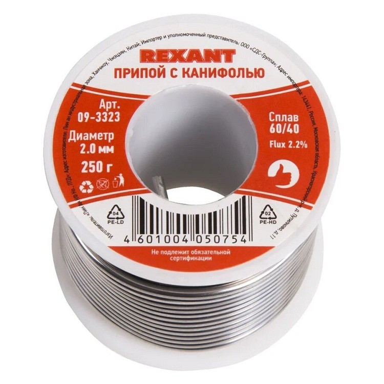 Припой с канифолью Rexant 09-3323 представляет собой проволоку диаметром 2 мм из сплава олова (60 %) и свинца (40 %). Это, так называемый, мягкий припой. Он используется в пайке для соединения деталей между собой или для их фиксирования на плате, отлично подходит для радиомонтажных работ.