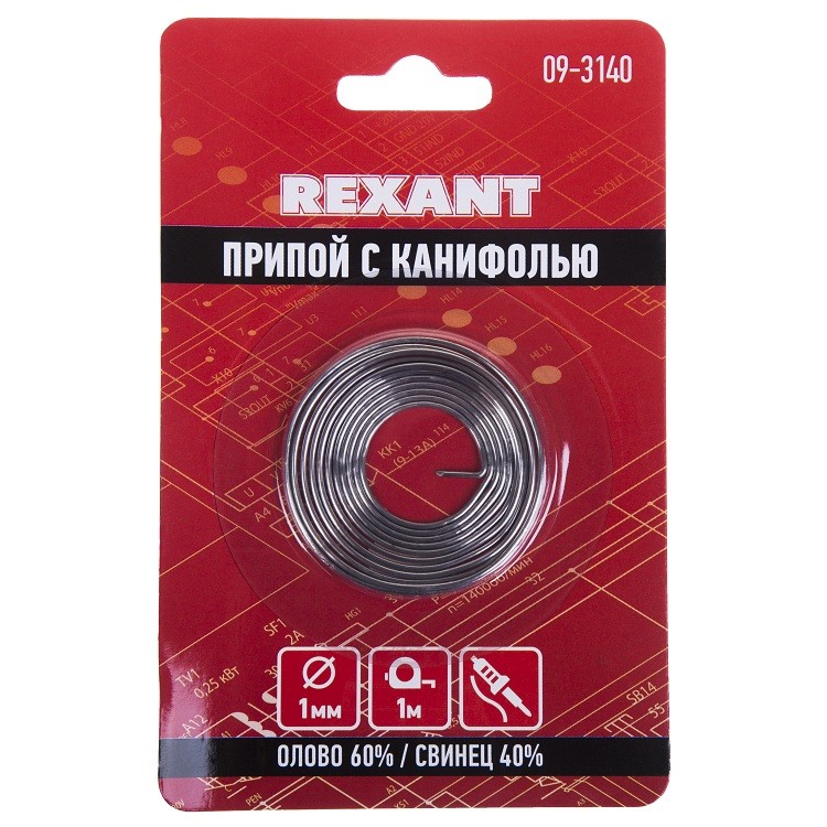 Припой с канифолью Rexant 09-3140 представляет собой проволоку диаметром 1 мм из сплава олова (60 %) и свинца (40 %). Это так называемый мягкий припой. В состав также входит специальный флюс без запаха. Припой используется в пайке для соединения деталей между собой или для их фиксирования на плате, отлично подходит для радиомонтажных работ.