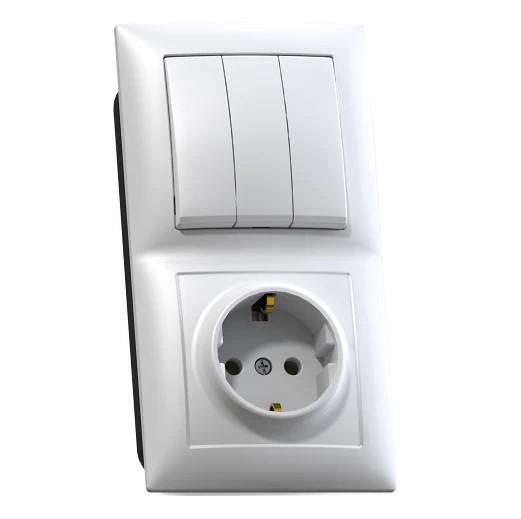 Блок комбинированный Кунцево-Электро Селена БКВР-413: трехклавишный выключатель и розетка с заземлением для скрытой установки предназначен для вертикального монтажа. Корпус изделия изготовлен из ударопрочного, высококачественного ABS-пластика.