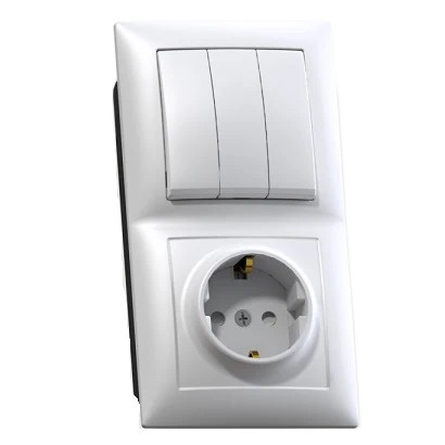 Блок комбинированный Кунцево-Электро Селена БКВР-416: трехклавишный выключатель и розетка с заземлением и защитными шторками для скрытой установки предназначен для вертикального монтажа. Корпус изделия изготовлен из ударопрочного, высококачественного ABS-пластика.