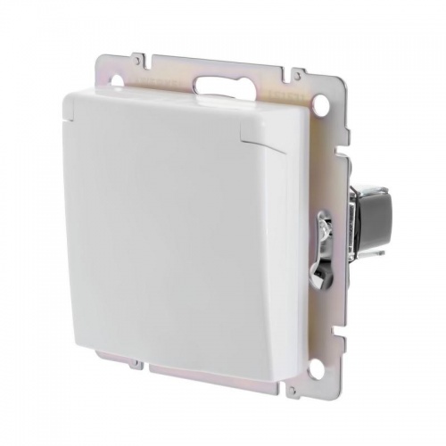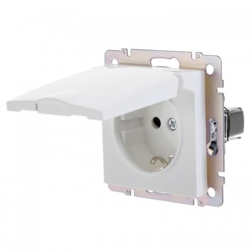 Механизм розетки Werkel WL01-SKGSC-01-IP44 одноместный с заземлением и защитными шторками с крышкой белый белого цвета поставляется без рамки, устанавливается на одно монтажное место.