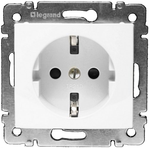 Механизм розетки Legrand Valena 774421 с заземлением одноместная белого цвета поставляется без рамки, устанавливается на одно монтажное место и является розеткой немецкого стандарта. Рассчитан на максимальную нагрузку до 3,2 кВт, а также имеет степень защиты от пыли и влаги IP 21. Оборудован винтовыми зажимами контактной группы, позволяющими закреплять проводники с сечением до 2,5 кв. мм. Устанавливается в стандартную коробку скрытого монтажа, а рамка защелкивается на механизме.