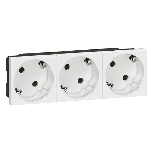 Механизм розетки 3-местной 3х2К+З под углом 45 градусов Legrand Mosaic 077253 6 модулей с заземлением белый предназначен для монтажа в кабель-канал при помощи суппортов Mosaic. Также может устанавливаться во встраиваемые и накладные монтажные коробки, колонны, напольные лючки, блоки розеток или настольные блоки. Оборудован специальными безвинтовыми зажимами для максимально надежного крепежа. Является розеткой немецкого стандарта и полностью отвечает всем международным требованиям к качеству электроустановочного оборудования.
