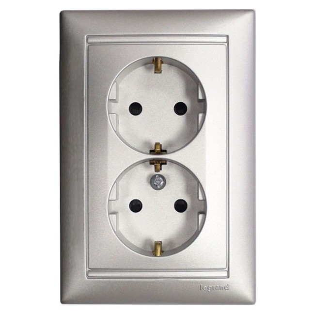 Розеточный блок 2-местный 2х2К+З Legrand Valena СП 16А 770100 с заземлением алюминий поставляется в сборе, то есть вместе с рамкой, имеет заземление и является розеткой немецкого стандарта. Имеет степень защиты от пыли и влаги IP 20. Розетка оборудована винтовыми зажимами контактной группы, позволяющими закреплять проводники с сечением до 2,5 кв. мм. Устанавливается в стандартную коробку скрытого монтажа, а рамка защелкивается на механизме.