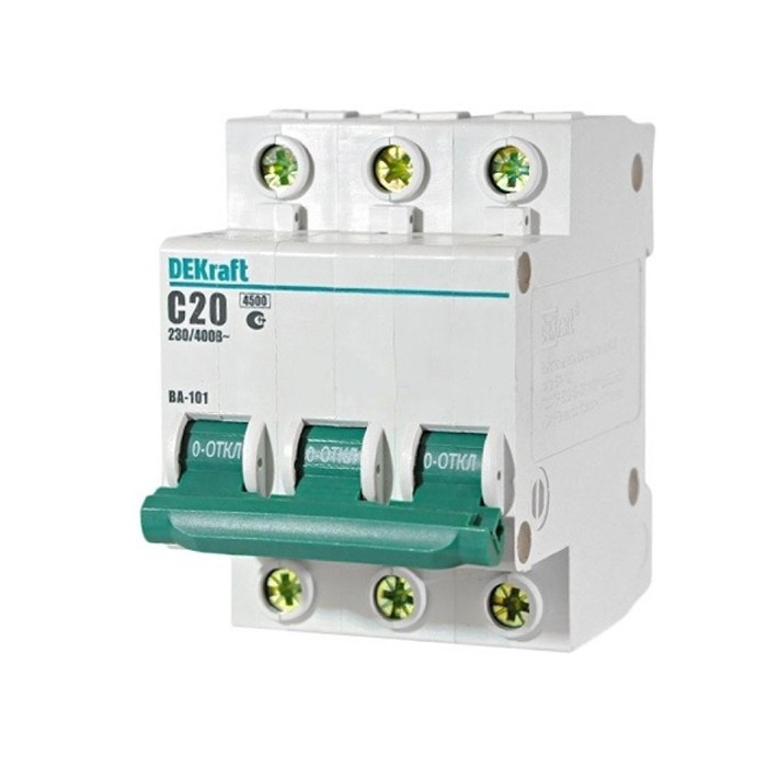 Автоматический выключатель DEKraft ВА-101 3п C 20А 4.5кА предназначен для применения в электрических цепях переменного тока с целью их защиты при перегрузках и токах короткого замыкания (КЗ). Также может использоваться для нечастых оперативных включения и отключений указанных цепей. Устанавливаются в вводно-распределительных устройствах, распределительных щитках (квартирных и этажных), в электрощитах общественных зданий - детских дошкольных учреждениях, учебных учреждениях, спортивных центрах, гостиницах, санаториях, ресторанах, магазинах, АЗС, административных зданиях, производственных помещениях и т.д.