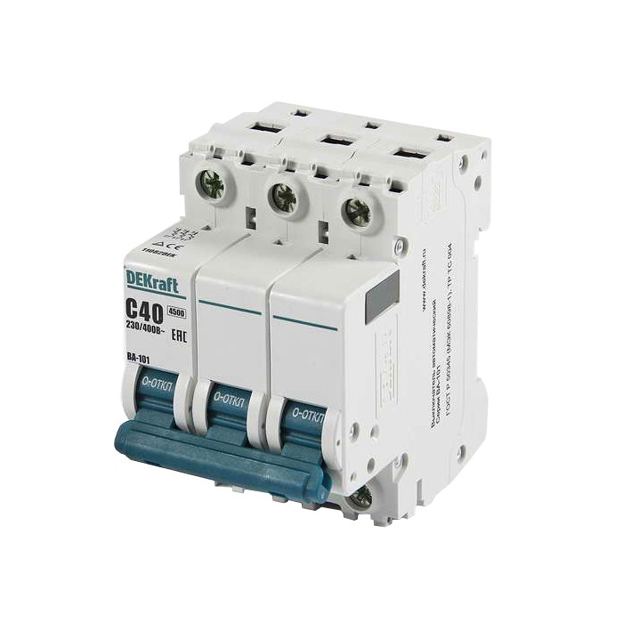 Автоматический выключатель DEKraft ВА-101 3п C 40А 4.5кА предназначен для применения в электрических цепях переменного тока с целью их защиты при перегрузках и токах короткого замыкания (КЗ). Также может использоваться для нечастых оперативных включения и отключений указанных цепей. Устанавливаются в вводно-распределительных устройствах, распределительных щитках (квартирных и этажных), в электрощитах общественных зданий - детских дошкольных учреждениях, учебных учреждениях, спортивных центрах, гостиницах, санаториях, ресторанах, магазинах, АЗС, административных зданиях, производственных помещениях и т.д.