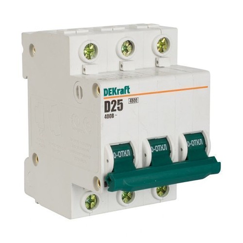 Автоматический выключатель DEKraft ВА-101 3п D 25А 4.5кА предназначен для применения в электрических цепях переменного тока с целью их защиты при перегрузках и токах короткого замыкания (КЗ). Также может использоваться для нечастых оперативных включения и отключений указанных цепей. Устанавливаются в вводно-распределительных устройствах, распределительных щитках (квартирных и этажных), в электрощитах общественных зданий - детских дошкольных учреждениях, учебных учреждениях, спортивных центрах, гостиницах, санаториях, ресторанах, магазинах, АЗС, административных зданиях, производственных помещениях и т.д.
