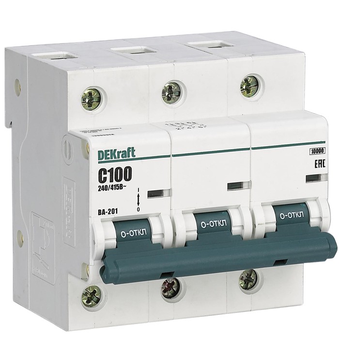 Автоматический выключатель DEKraft ВА-201 3п C 100А 10кА служит для защиты электрических цепей от перегрузок и токов короткого замыкания. Применяется во вводно-распределительных щитах жилых и административных зданий, а также в промышленности.