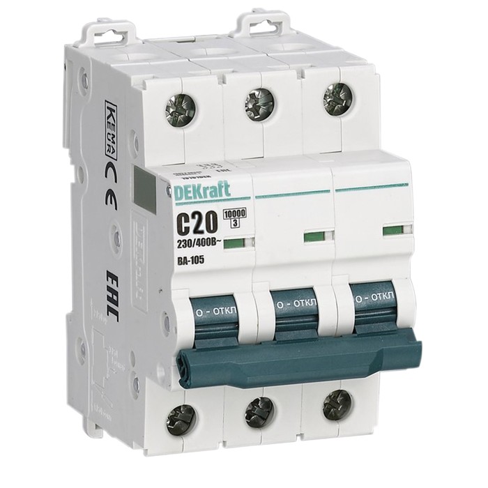 Автоматический выключатель DEKraft ВА-105 3п C 20А 10кА предназначен для применения в электрических цепях с целью их защиты при перегрузках и токах короткого замыкания (КЗ). Преимуществом выключателей ВА-105 является их высокая механическая и коммутационная износостойкость — в 20 000 и 10 000 циклов соответственно. В новой серии для большего удобства также предусмотрена возможность применения независимых расцепителей на переменный и постоянный ток, а также возможность установки устройств на аппараты гребенчатых шин типа PIN.
