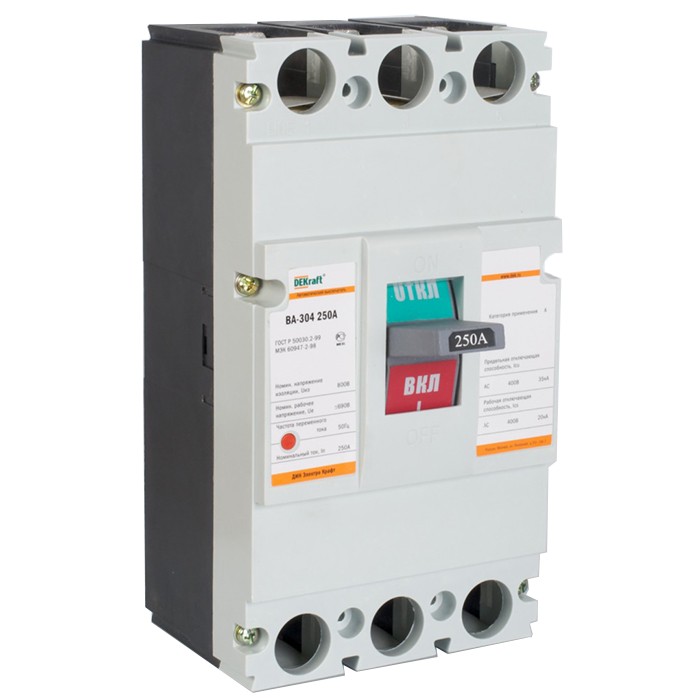 Автоматический выключатель DEKraft ВА-304 250А 35кА имеет компактные размеры, с лёгкостью могжет быть установлен в любой электротехнический шкаф и сохранит допустимые рабочие характеристики, даже под воздействием повышенных температур. Устройство этой категории безопасно для окружающей среды.