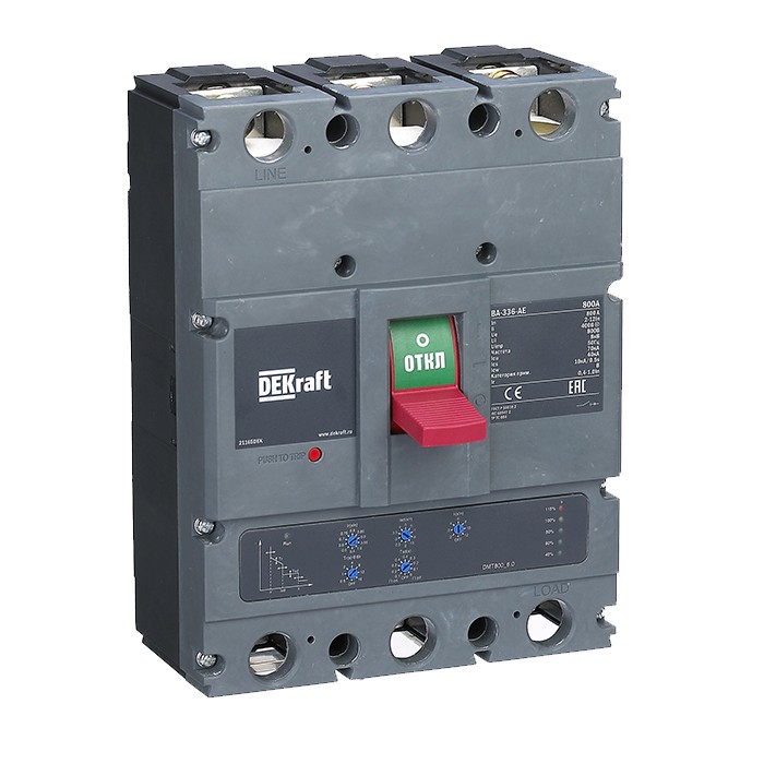 Автоматический выключатель DEKraft ВА-336 АЕ с электронным расцепителем 800А 70кА предназначен для использования в силовых распределительных цепях напряжением до 690В (50Гц~) для распределения электрической энергии, а также защиты цепей и оборудования от повреждений, которые могут возникнуть из-за перегрузок, токов короткого замыкания и пониженного напряжения.