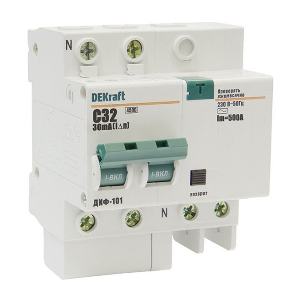 Автоматический выключатель дифференциального тока DEKraft ДИФ-101 2п C 32А 30мА тип AC 4.5кА средства защиты человека от поражения электрическим током. Также выполнят функци защиты электрических сетей от перегрузок, предотвращают короткие замыкания. Принцип работы дифавтомата довольно прост: когда он включён, в нормальном режиме, через образованную в нём силовую цепь течёт электрический ток. Если человек прикасается к открытым частям электропроводки, уровень утечки тока принимает не нулевое значение, в этот момент дифавтомат размыкает цепь и подача тока прекращается. Дифавтоматы обычно устанавливают для защиты одиночного потребителя. Недостатками этого средства электрической защиты является невозможность установить причины его отключения, упрощённая схема гашения дуги, а также сложность конструкции, а значит, дороговизна изделия.
