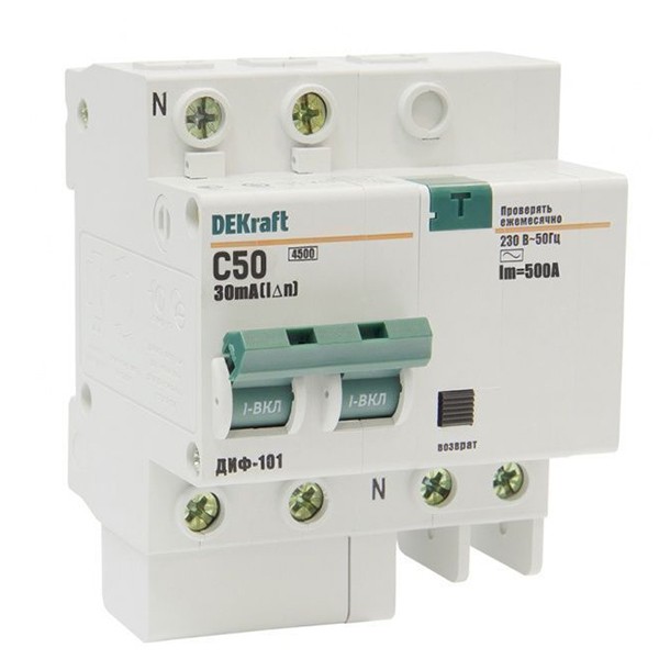 Автоматический выключатель дифференциального тока DEKraft ДИФ-101 2п C 50А 30мА тип AC 4.5кА средства защиты человека от поражения электрическим током. Также выполнят функци защиты электрических сетей от перегрузок, предотвращают короткие замыкания. Принцип работы дифавтомата довольно прост: когда он включён, в нормальном режиме, через образованную в нём силовую цепь течёт электрический ток. Если человек прикасается к открытым частям электропроводки, уровень утечки тока принимает не нулевое значение, в этот момент дифавтомат размыкает цепь и подача тока прекращается. Дифавтоматы обычно устанавливают для защиты одиночного потребителя. Недостатками этого средства электрической защиты является невозможность установить причины его отключения, упрощённая схема гашения дуги, а также сложность конструкции, а значит, дороговизна изделия.