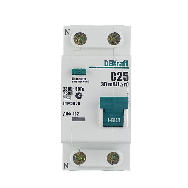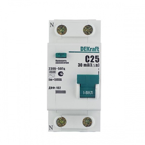 Автоматический выключатель дифференциального тока DEKraft ДИФ-102 (1P+N) C 25А 30мА тип AC 4.5кА средства защиты человека от поражения электрическим током. Также выполнят функци защиты электрических сетей от перегрузок, предотвращают короткие замыкания. Принцип работы дифавтомата довольно прост: когда он включён, в нормальном режиме, через образованную в нём силовую цепь течёт электрический ток. Если человек прикасается к открытым частям электропроводки, уровень утечки тока принимает не нулевое значение, в этот момент дифавтомат размыкает цепь и подача тока прекращается. Дифавтоматы обычно устанавливают для защиты одиночного потребителя. Недостатками этого средства электрической защиты является невозможность установить причины его отключения, упрощённая схема гашения дуги, а также сложность конструкции, а значит, дороговизна изделия.