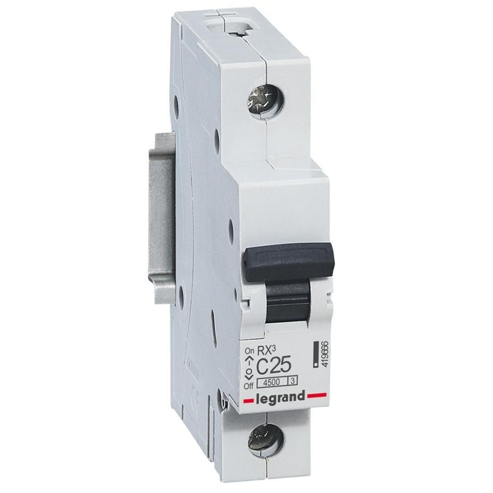 Автоматический выключатель Legrand RX3 419666 1P C 25A 4,5 кА предназначен для использования в электрических сетях для защиты от перегрузочных явлений и сверх высоких токов, возникающих при коротких замыканиях. Автоматический выключатель имеет отключающую способность токов короткого замыкания в 4,5кА, что более чем достаточно для их использования в частных домах, коттеджах, квартирах, офисах и небольших производствах. Для профессиональных целей они подойдут, если не предполагается подключение дополнительных устройств – независимого расцепителя, расцепителя минимального напряжения, различных дополнительных контактов.