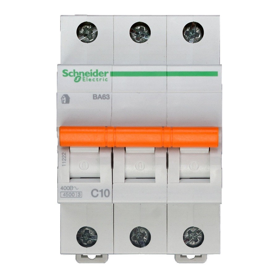 Автоматический выключатель Schneider Electric Домовой ВА63 3П C 10A 4,5кА используется для распределения нагрузки, а также защиты от перегрузок и коротких замыканий. Корпус изготовлен из прочного пластика, надежного и долговечного материала. Выключатель монтируется в щиток на DIN-рейку, снащен тумблерным переключателем.