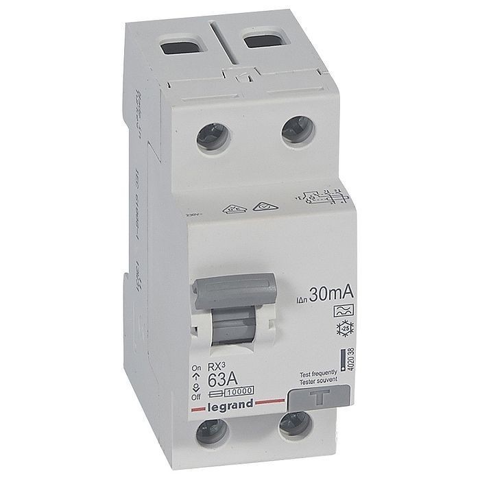 Выключатель дифференциального тока Legrand RX3 402038 2P A 63А 30мА управляемый дифференциальным переменным током, без встроенной защиты от сверхтока с непосредственным указанием положения главных контактов, предназначен для управления нагрузками и разъединения электрических цепей, защиты людей от прямого и косвенного прикосновения и защиты электроустановок от нарушения изоляции. Применяется в жилых помещениях, на коммерческих и промышленных объектах. Установка вспомогательных устройств не предусмотрена.