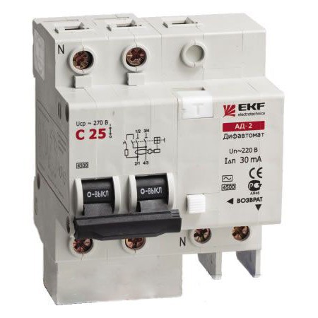 Дифференциальный автоматический выключатель представляет собой аппарат, сочетающий функции автоматического выключателя с устройством защитного отключения. При обнаружении автоматическим выключателем в защищаемом участке сети тока утечки (повреждения) на землю или сверхтока (тока перегрузки или короткого замыкания) происходит срабатывание устройства, приводящее к отключению защищаемой сети. Особое отличие дифференциальных автоматов EKF в наличии встроенного блока защиты от перенапряжения. АД-2 и АД-4 выпускаются в стандартном и селективном (АД-2S, АД-4S) исполнениях.