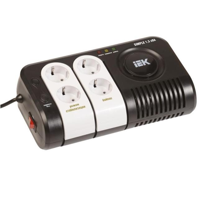 Стабилизатор IEK Simple имеет 4 розетки для подключения нагрузки: 2 в режиме стабилизации, 2 в режиме байпас. На стабилезаторе имеются индикаторы режима работы, задержки времени включения, срабатывания защиты.