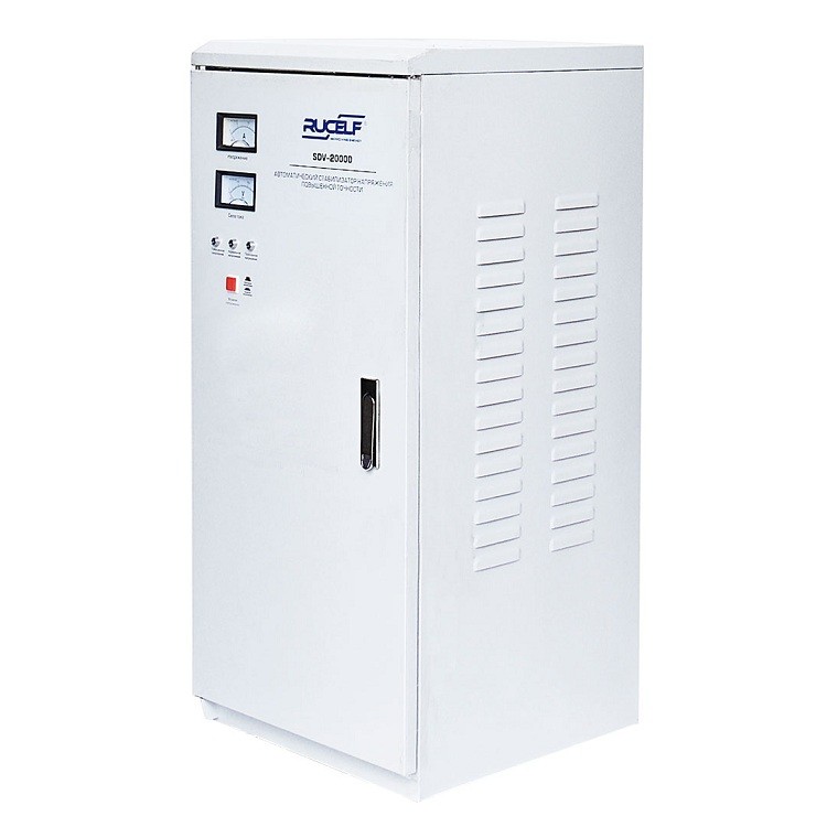 Стабилизатор напряжения Rucelf SDV-20000предназначен для поддержания стабильного напряжения в однофазных сетях для питания электроприборов бытового назначения 220 В, 50 Гц. Данная серия стабилизаторов напряжения разработана для защиты подключенных устройств при перепадах входного напряжения от 150 до 260 В.