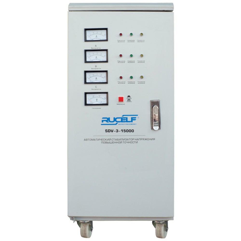 Стабилизатор напряжения RUCELF SDV-3-15000 предназначен для обеспечения стабильным сетевым напряжением как бытовых так и промышленных объектов. Стабилизатор выполнен по схеме автотрансформатора в корпусе с жидкокристалличечкой индикацией, конструктивно представляет собой сочетание трех однофазных стабилизаторов, каждый из которых отвечает за регулирование напряжения по соответствующей фазе, и контроллера, согласующего их работу. В случае пропадания фаз срабатывает механизм защитного отключения потребителя. Модульная схема позволяет повысить надежность электроснабжения и обеспечить стабилизацию как фазных, так и линейных напряжений. Не вносит искажений в формувходного напряжения.