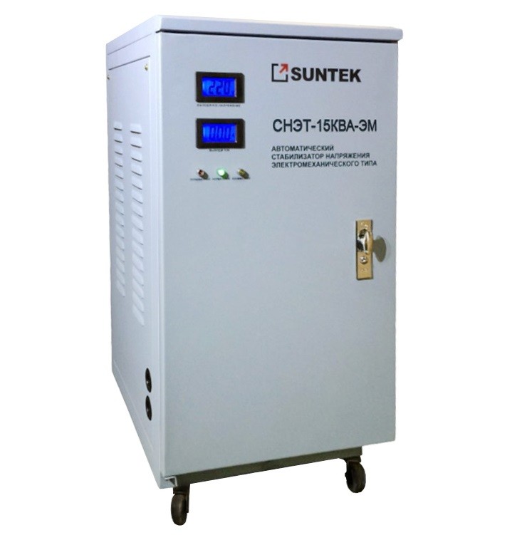 Стабилизатор напряжения Suntek 15000 ВА-ЭМ электромеханический - мощный стабилизатор напряжения электромеханического типа, отлично подходит для стабилизации напряжения в загородном доме, коттедже, на производственном объекте. Металлический корпус, ЖК-табло, плавность регулирования. Режим работы – круглосуточно.