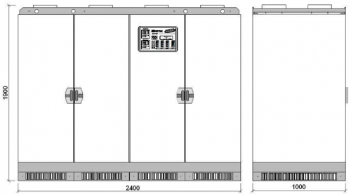 В данных стабилизаторах применяется естественная вентиляция и дополнительное охлаждение при помощи вентиляторов, когда температура внутри корпуса превышает 45°C. На дверце шкафа размещены два цифровых мультиметра. Эти устройства отображают информацию о входных и выходных параметрах стабилизатора, таких как фазное и линейное напряжение, ток, коэффициент мощности, активная, полная, реактивная мощность и т.д.