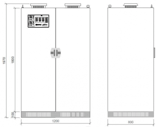 В данных стабилизаторах применяется естественная вентиляция и дополнительное охлаждение при помощи вентиляторов, когда температура внутри корпуса превышает 45°C. На дверце шкафа размещены два цифровых мультиметра. Эти устройства отображают информацию о входных и выходных параметрах стабилизатора, таких как фазное и линейное напряжение, ток, коэффициент мощности, активная, полная, реактивная мощность и т.д.