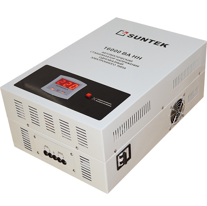 Стабилизатор пониженного напряжения Suntek 16000ВА-НН - для обеспечения 220 V загородного коттеджа, дома либо производственной площадки, автосервиса. Широкий рабочий диапазон 90-285 Вольт, мгновенная скорость срабатывания, переключения реле без разрыва цепи. Режим работы – круглосуточно.