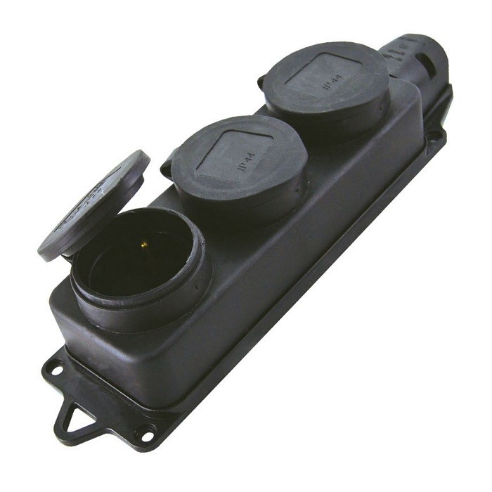 Колодка TDM SQ0612-0008 с тремя розетками и заглушками предназначена для подключения электрооборудования и электроинструмента в сложных эксплуатационных условиях как внутри помещений, так и на открытом воздухе: