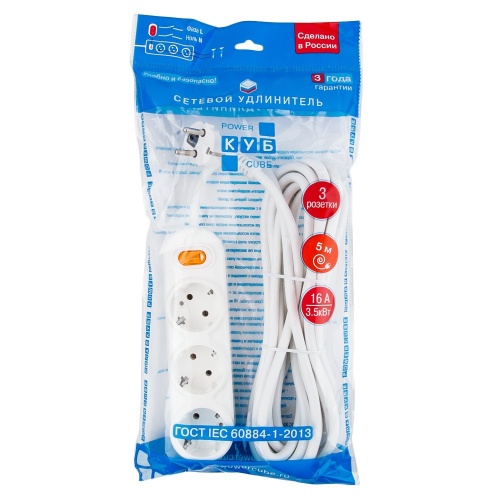 Удлинитель Power Cube PC-Y-6-3S-5 - сетевой удлинитель с двухполюсным выключателем, тремя розетками с заземлением и удобными отверстиями для крепежа.