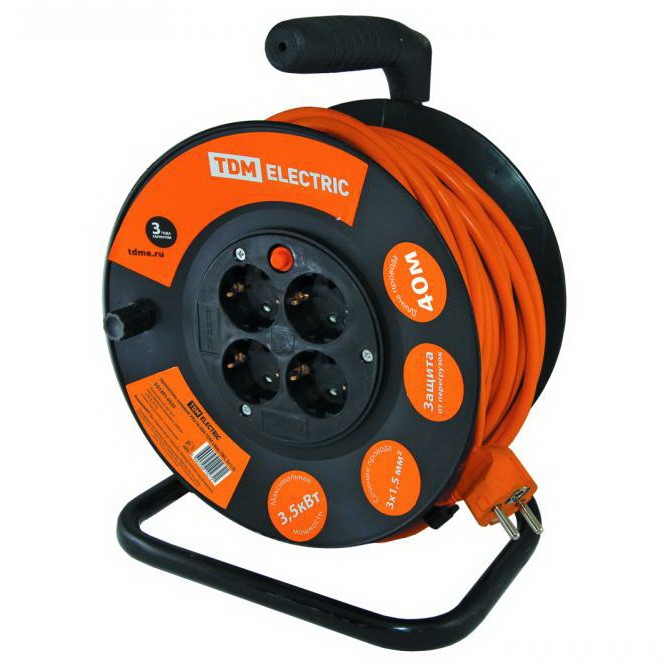 Удлинитель силовой на катушке TDM SQ1301-0535 УКз16-004 на 4 розетки с заземлением предназначен для подключения подключения электроприборов, удаленных на расстояние до 40 м от стационарной розетки. Цвет провода – оранжевый.