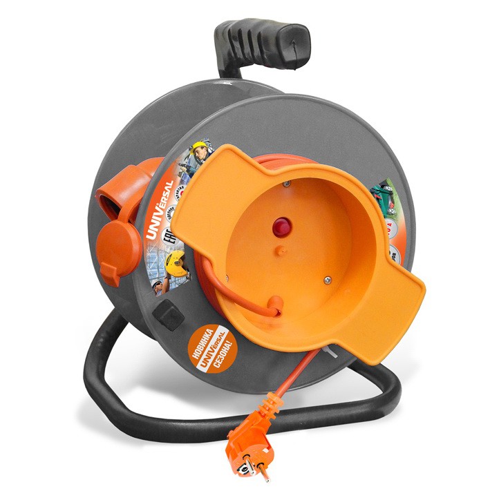 Удлинитель UNIVersal У10-027 9633279 (второе название удлинители для газонокосилок) имеет цельнолитой корпус типа «катушка», закрепленный на стальной стойке. Корпус катушки изготовлен из полипропилена . Мягкая силиконовая ручка обеспечивает удобное удержание и транспортировку удлинителя. Провод типа ПВС 3х1 с заземлением не спутывается, благодаря катушке, он оснащен на конце неразборным штепсельным гнездом со степень защиты от пыли и влаги IP54. На лицевой панели расположен автомат защиты от перегрузок.