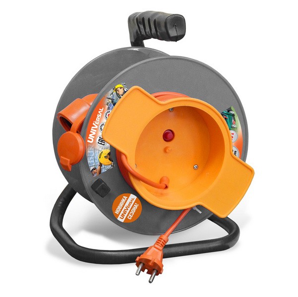 Удлинитель UNIVersal У10-028 9633262 (второе название удлинители для газонокосилок) имеет цельнолитой корпус типа «катушка», закрепленный на стальной стойке. Корпус катушки изготовлен из полипропилена. Мягкая силиконовая ручка обеспечивает удобное удержание и транспортировку удлинителя. Провод типа ПВС 2х0,75 без заземления не спутывается, благодаря катушке, он оснащен на конце неразборным штепсельным гнездом со степень защиты от пыли и влаги IP54. На лицевой панели расположен автомат защиты от перегрузок.