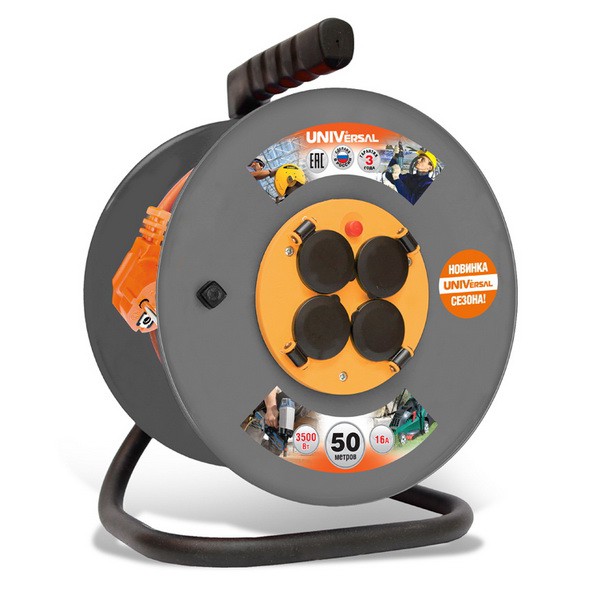 Удлинитель UNIVersal ВЕМ-250 9634175 имеет цельнолитой корпус типа «катушка», закрепленный на стальной стойке. Диаметр корпуса 240 мм, изготовлен из полипропилена. Эргономичная изолирующая ручка обеспечивает удобное удержание и транспортировку удлинителя. Провод типа ПВС 3х1,5 не спутывается, благодаря катушке. На лицевой панели расположены четыре розетки с подпружиненными крышками для защиты от пыли и влаги.
