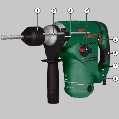 | 1. Патрон 2. Ограничитель глубины 3. Дополнительная рукоятка 4. Переключатель режимов работы 5. Выключатель 6. Мягкая накладка 7. Д-образная рукоятка 8. Регулятор скорости |