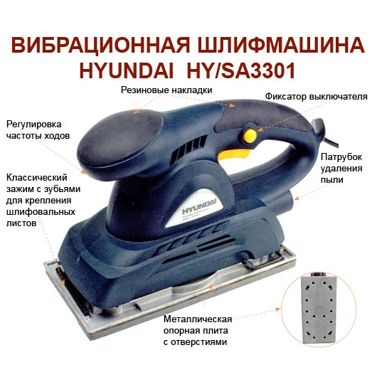 Финишная плоскошлифовальная машина полупрофессионального класса Hyundai HY/SA3301 предназначена для сухой окончательной шлифовки древесных плит, плоских деревянных поверхностей, окрашенных и шпатлёванных деталей, пластика и т. п. Благодаря облегченной конструкции, исключительной эргономичности и компактности, удобна для применения мобильными ремонтными бригадами, мастерами-паркетчиками, индивидуальными застройщиками, дачниками. Может также успешно использоваться в небольших столярных цехах, на вспомогательных участках промпредприятий, на сельскохозяйственных объектах и в жилищно-коммунальном хозяйстве.
