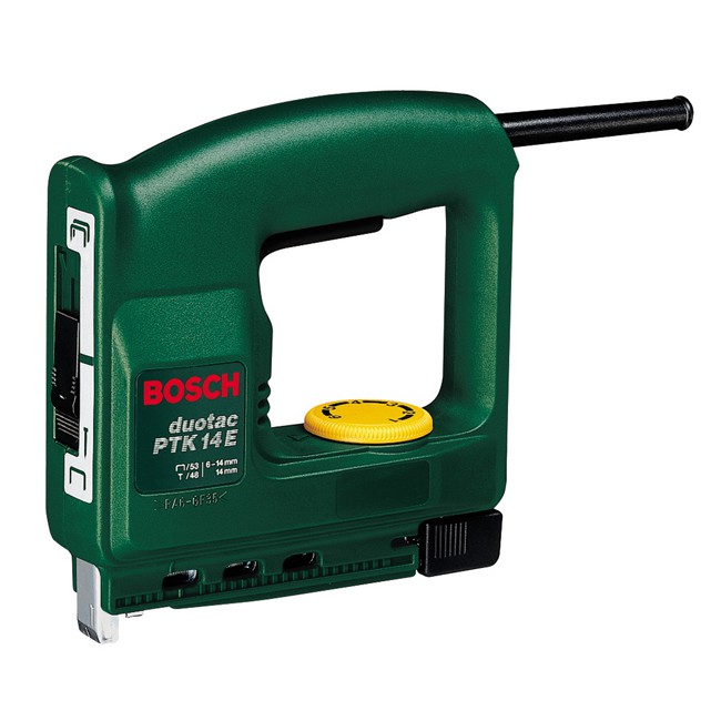 Электрический степлер Bosch PTK 14 E оснащен автоматикой Bosch-duotac - для забивания двух скоб одновременно. Предусмотрена функция одиночного или многократного удара. Степлер оснащен электронным управлением и указателем количества скоб. Выполнение удара осуществляется за счет нажатия на курок и прижима острия степлера к заготовке.
