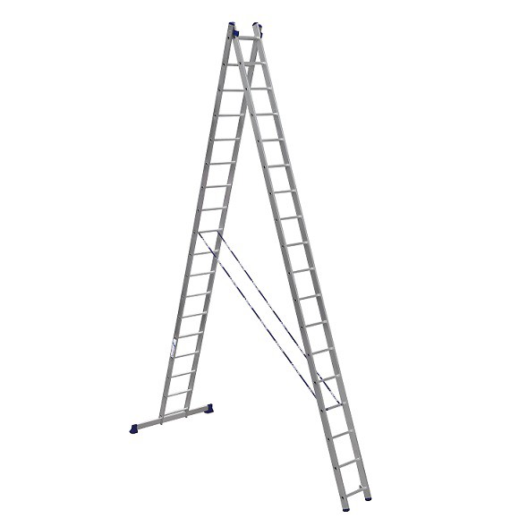 Преимущество двухсекционной лестницы относительно односекционной - это меньшие габариты при одинаковой достигаемой высоте, возможность использовать лестницу как стремянку, отсутствие необходимости в вертикальной опоре, регулируемая высота подъема за счет своей телескопической конструкции, наличие стабилизатора увеличенной ширины для более высокой устойчивости. Лестница выдерживает вес до 150 кг.