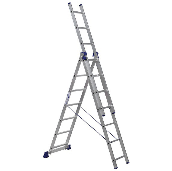 Это лестница, которая сочетает в себе сразу функции приставной лесницы, стремянки и двухсекционной лестницы. Она собрала все преимущества односекционной и двухсекционной лестниц. Состоящая из трех частей, она может использоваться в широком диапазоне высот. Имеется возможность применять верхнюю секцию, как отдельную небольшую приставную лестницу.