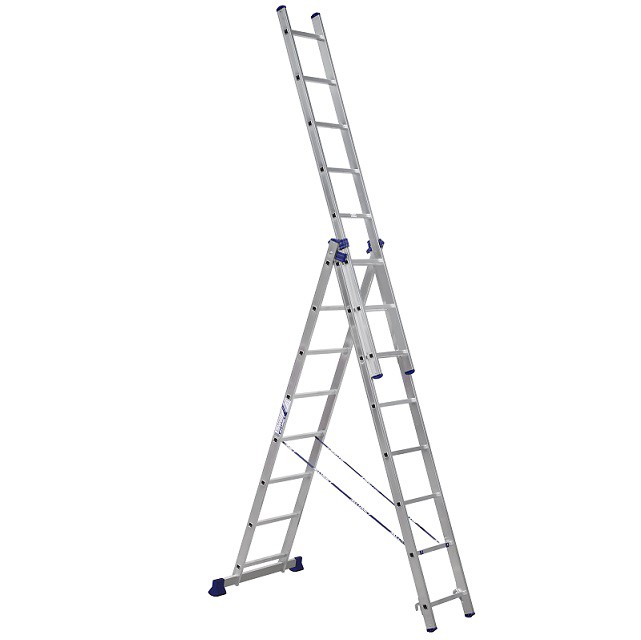 Это лестница, которая сочетает в себе сразу функции приставной лесницы, стремянки и двухсекционной лестницы. Она собрала все преимущества односекционной и двухсекционной лестниц. Состоящая из трех частей, она может использоваться в широком диапазоне высот. Имеется возможность применять верхнюю секцию, как отдельную небольшую приставную лестницу.