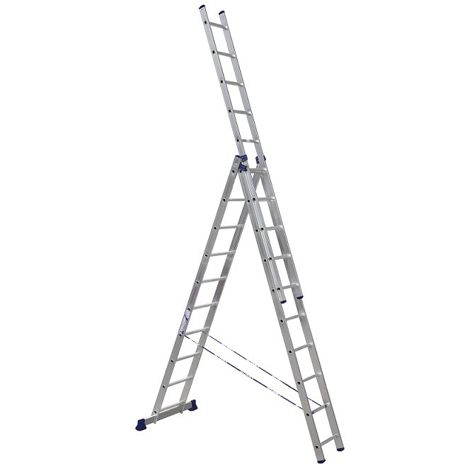 Это лестница, которая сочетает в себе сразу функции приставной лесницы, стремянки и двухсекционной лестницы. Она собрала все преимущества односекционной и двухсекционной лестниц. Состоящая из трех частей, она может использоваться в широком диапазоне высот. Имеется возможность применять верхнюю секцию, как отдельную небольшую приставную лестницу.