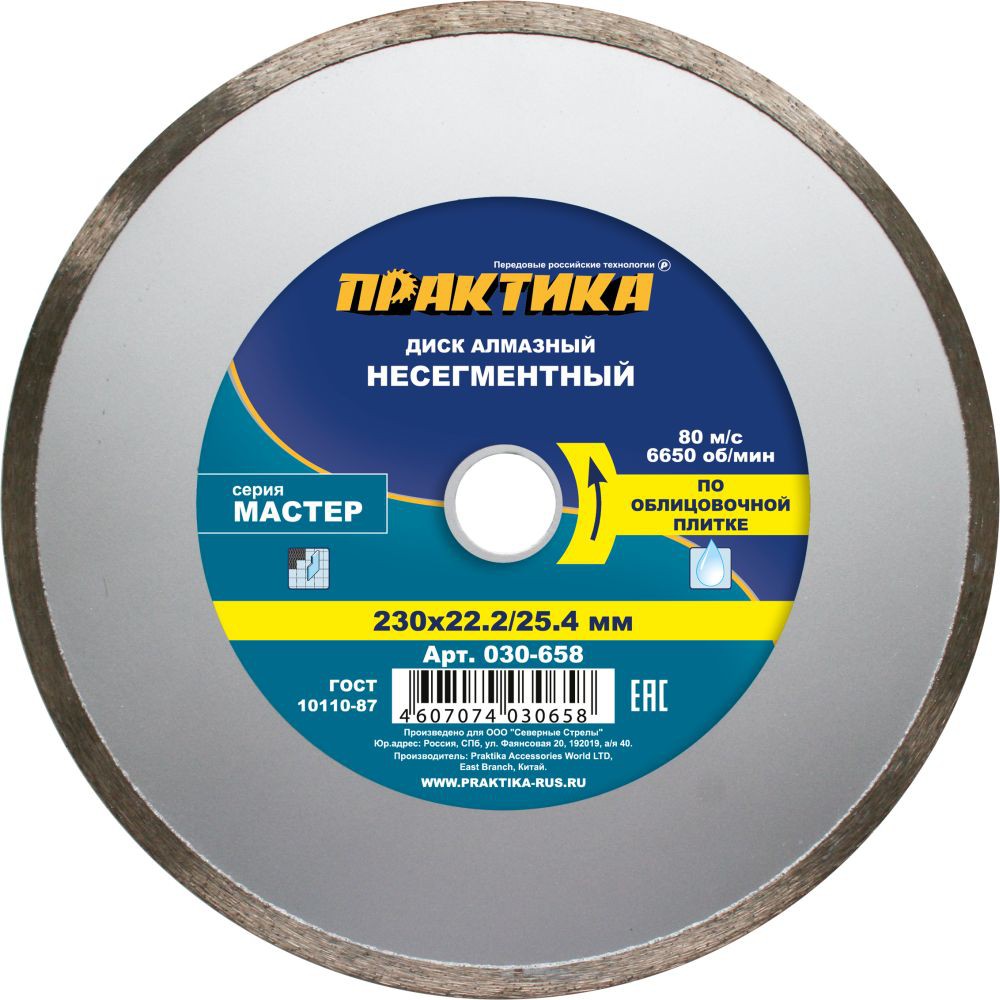 Алмазный диск Практика Мастер 030-658 предназначен для пиления керамической и мраморной облицовочной плитки. Применяется для работы с ручным инструментом и небольшими станками. Диск имеет очень высокую скорость и стабильную глубину реза. Его диаметр составляет 230 мм.
