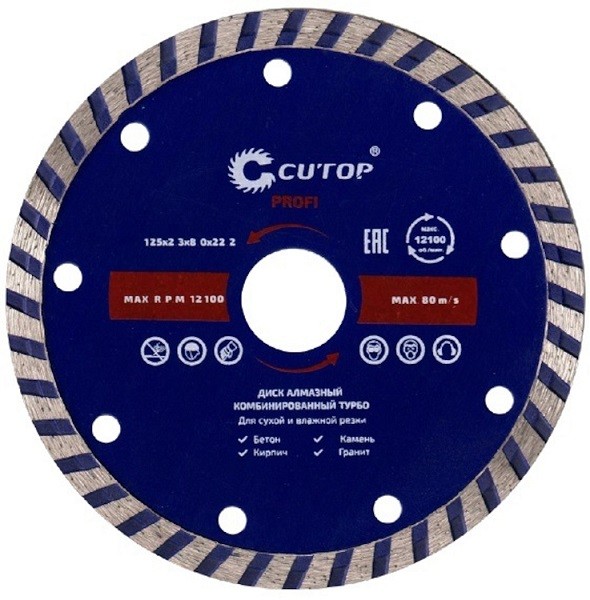 Диск алмазный Cutop Profi 61-12523 является довольно универсальным и предназначен для резки бетона, кирпича, гранита, мрамора, и камня. Используется совместно с электроинструментом. Усиленная конструкция.